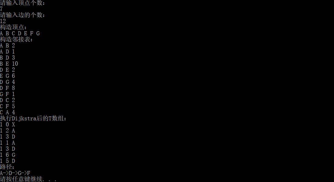 运行结果:(运行结果中的路径是从0即顶点A到顶点F的路径)