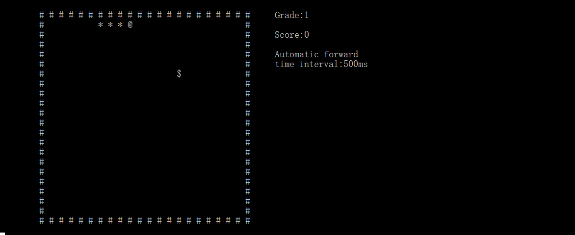 1 #include<iostream> 2 #include<windows.h> 3 #include<time.h> 4 #include<conio.h> 5 #define H 22 6 #define W 22 7 using namespace std; 8 9 class chessboard 10 { 11 public: 12 char qp[H][W]; 13 int i,j,x1,y1; 14 chessboard(); 15 void food(); 16 void prt(int grade,int score,int gamespeed); 17 }; 18 chessboard::chessboard() 19 { 20 for(i=1;i<=H-2;i++) 21 for(j=1;j<=W-2;j++) 22 qp[i][j]=' '; 23 for(i=0;i<=H-1;i++) 24 qp[0][i] = qp[H-1][i] = '#'; 25 for(i=1;i<=H-2;i++) 26 qp[i][0] = qp[i][W-1] = '#'; 27 food(); 28 } 29 void chessboard::food() 30 { 31 srand(time(0)); 32 do 33 { 34 x1=rand()%W-2+1; 35 y1=rand()%H-2+1;//x1,y1坐标表示食物位置 36 } 37 while(qp[x1][y1]!=' '); 38 qp[x1][y1]='$'; 39 } 40 void chessboard::prt(int grade,int score,int gamespeed) 41 { 42 system("cls"); 43 cout << endl; 44 for(i=0;i<H;i++) 45 { 46 cout << "\t"; 47 for(j=0;j<W;j++) 48 cout<<qp[i][j]<<' '; 49 if(i==0) cout << "\tGrade:" << grade;//在第0行输出Grade 50 if(i==2) cout << "\tScore:" << score;//在第2行输出Score 51 if(i==4) cout << "\tAutomatic forward"; 52 if(i==5) cout << "\ttime interval:" << gamespeed << "ms"; 53 cout<<endl; 54 } 55 } 56 class snake:public chessboard 57 { 58 public: 59 int zb[2][100];//用于记录蛇头和蛇身的位置,zb[0][i]为x值,zb[1][i]为y值 60 long start; 61 int head,tail,grade,score,gamespeed,length,timeover,x,y;//x,y用于记录新的头部位置 62 char direction; 63 snake(); 64 void move(); 65 }; 66 snake::snake() 67 { 68 cout<<"\n\n\t\tThe game is about to begin!"<<endl; 69 for(i=3;i>=0;i--) 70 { 71 start=clock(); 72 while(clock()-start<=1000);//延时1000ms 73 system("cls"); 74 if(i>0) 75 cout << "\n\n\t\tCountdown:" << i << endl; 76 } 77 for(i=1;i<=3;i++) 78 qp[1][i]='*'; 79 qp[1][4]='@'; 80 for(i=0; i<4; i++) 81 { 82 zb[0][i] = 1; 83 zb[1][i] = i + 1; 84 } 85 } 86 void snake::move() 87 { 88 score=0; 89 head = 3,tail = 0; 90 grade = 1, length = 4; 91 gamespeed = 500; 92 direction = 77; 93 while(1) 94 { 95 timeover = 1; 96 start = clock(); 97 while((timeover=(clock()-start<=gamespeed))&&!kbhit());//500ms的延时时间未到或者没有按键时在此等待 98 if(timeover) 99 { 100 //键盘的方向键有两个码值,所以要读取两次,而上下左右的第一个码值都是一样的,只有第二个有区别 101 /* 102 码值表如下: 103 上:-32 72 104 下:-32 80 105 左:-32 75 106 右:-32 77*/ 107 getch(); 108 direction = getch(); 109 } 110 switch(direction) 111 { 112 case 72: x= zb[0][head]-1; y= zb[1][head];break;//上:头部x减1,y不变 113 case 80: x= zb[0][head]+1; y= zb[1][head];break;//下:头部x加1,y不变 114 case 75: x= zb[0][head]; y= zb[1][head]-1;break;//左:头部x不变,y减1 115 case 77: x= zb[0][head]; y= zb[1][head]+1;break;//右:头部x不变,y加1 116 } 117 if(x==0 || x==21 ||y==0 || y==21)//蛇头撞墙了,游戏结束 118 { 119 cout << "\tGame over!" << endl;break; 120 } 121 if(qp[x][y]!=' '&&!(x==x1&&y==y1))//蛇头位置不在空格且也不是食物位置,即咬到自己了,游戏结束 122 { 123 cout << "\tGame over!" << endl;break; 124 } 125 if(x==x1 && y==y1)//吃到食物,(x,y)为蛇头位置 126 { 127 length ++;//蛇长加1 128 score=score+100;//分数加100 129 if(length>=8) 130 { 131 length -= 8; 132 grade ++; 133 if(gamespeed>=200) 134 gamespeed = 550 - grade * 50;//延时减短,即速度加快 135 } 136 qp[x][y]= '@';//食物的位置变为'@' 137 qp[zb[0][head]][zb[1][head]] = '*';//原来蛇头的位置变为'*' 138 head = (head+1)%100; 139 zb[0][head] = x;//更新头部位置 140 zb[1][head] = y; 141 food();//重新随机产生食物 142 prt(grade,score,gamespeed);//刷新积分榜 143 } 144 else//没吃到食物 145 { 146 qp[zb[0][tail]][zb[1][tail]]=' ';//尾部位置的地方变为空格 147 tail=(tail+1)%100; 148 qp[zb[0][head]][zb[1][head]]='*';//头部的位置变为'*' 149 head=(head+1)%100; 150 zb[0][head]=x; 151 zb[1][head]=y; 152 qp[zb[0][head]][zb[1][head]]='@';//在新的头部位置显示'@' 153 prt(grade,score,gamespeed);//刷新积分榜 154 } 155 } 156 } 157 int main() 158 { 159 chessboard cb; 160 snake s; 161 s.move(); 162 }