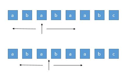 由于存在奇数的字符串和偶数的字符串,所以我们需要从一个字符开始扩展,或者从两个字符之间开始扩展