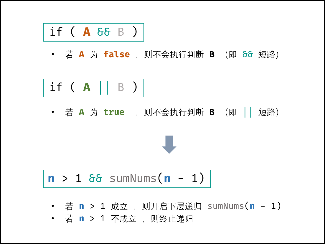 1 class Solution { 2 public: 3 int sumNums(int n) { 4 int sum=n; 5 bool flag=n>0&&(sum+=sumNums(n-1)); 6 return sum; 7 } 8 };