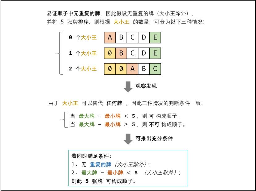 从扑克牌中随机抽5张牌,判断是不是一个顺子,即这5张牌是不是连续的。2~10为数字本身,A为1,J为11,Q为12,K为13,而大、小王为 0 ,可以看成任意数字。A 不能视为 14。