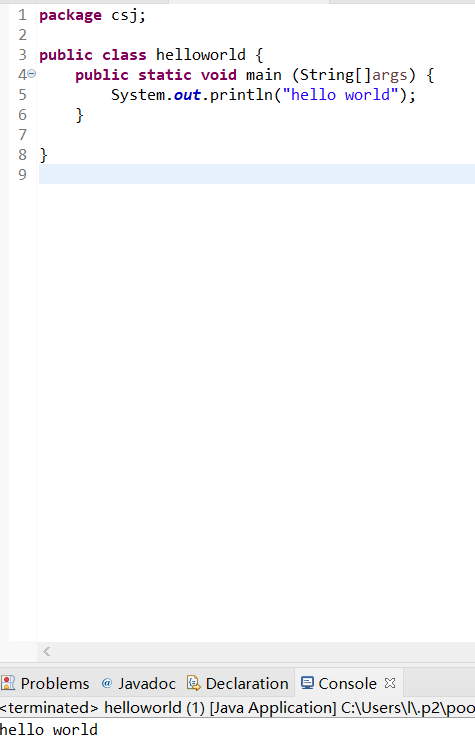 今天下载了eclipse,设置好了jdk环境,学习了helloworld案例,并了解了三种注释:单行注释(//...)、多行注释(/*.....*/)、文档注释的格式(/**....**/)。