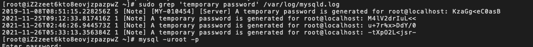 1) 超级用户帐户'root'@'localhost被创建。超级用户的密码被设置并存储在错误日志文件中。查看临时密码: