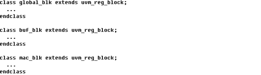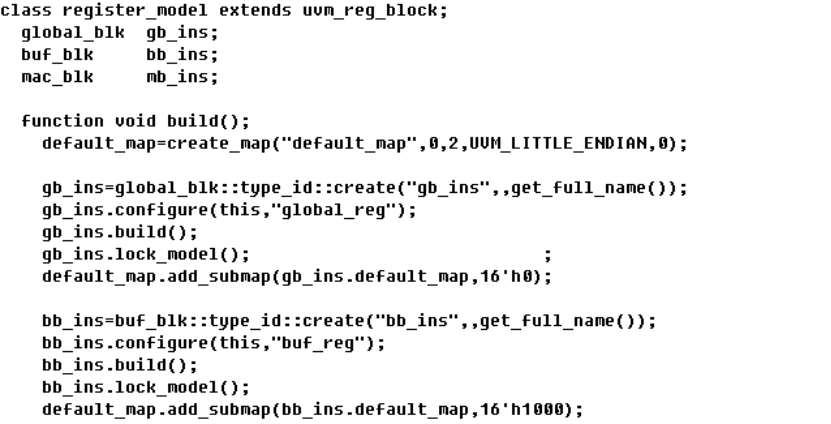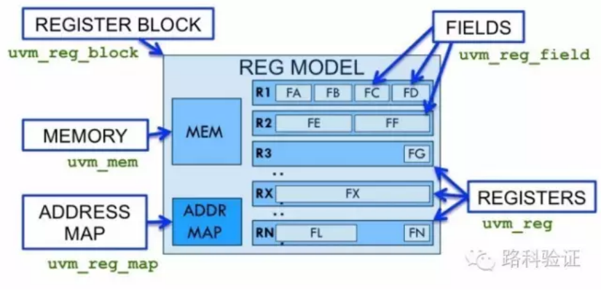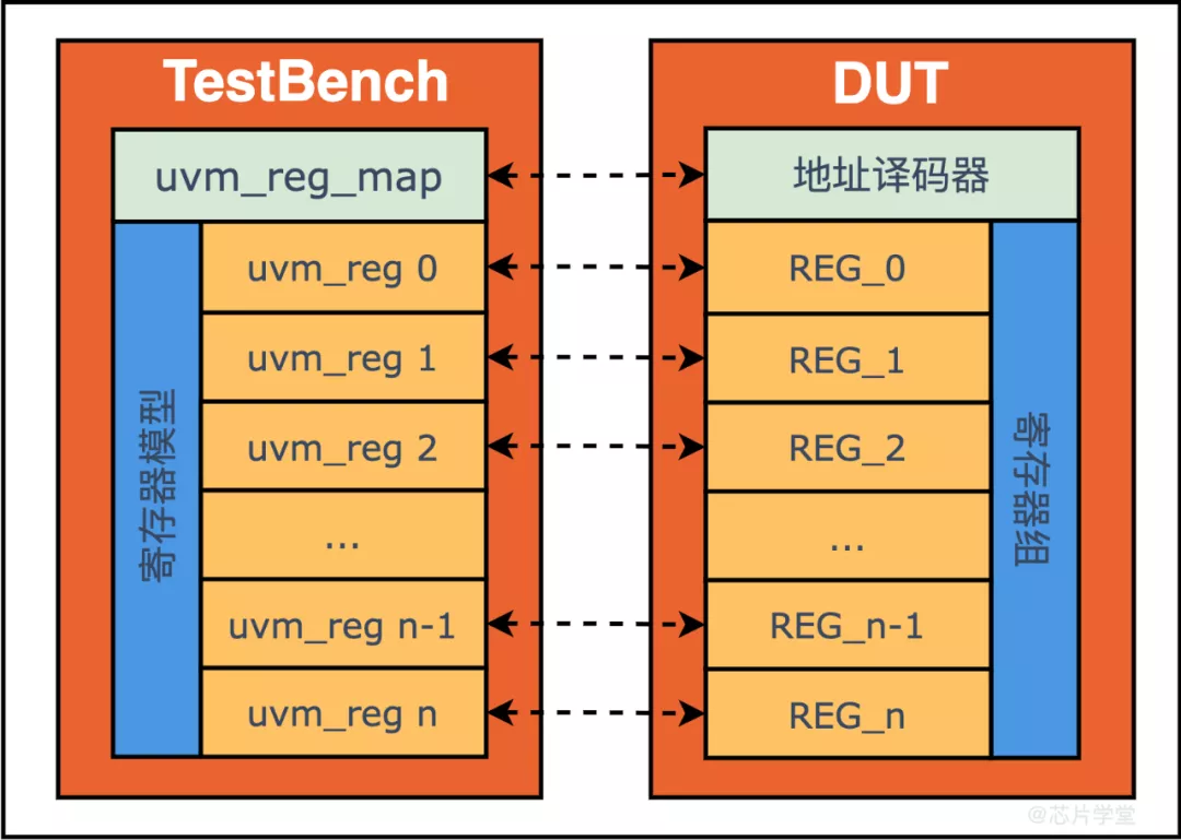 寄存器模型就是一些类的集合,这些类模拟了DUT中的存储器、寄存器以及寄存器、存储器映射行为.这些类用于产生特定激励,进行功能检查.