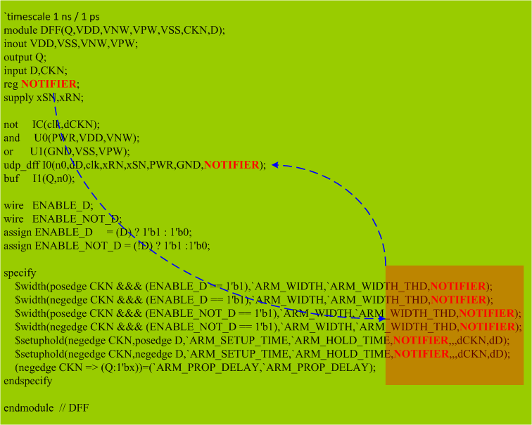 (2) 时序检查检测到时序违例后,notifier会发生变化;因此可以用于打印描述违例的error信息或者传播x态值用于报告时序违例(该参数的变化一般会影响到模拟触发器的UDP中真值表的行为,从而使触发器模型输出不定态,最终将不定态反映到仿真输出上);