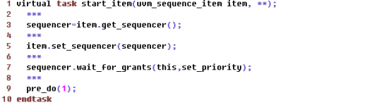 注1:通过调用start_item()方法等待获得sequencer的授权许可(sequencer.wait_for_grant),其后执行parent sequence的方法pre_do();
