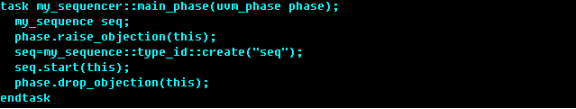 1 //示例 2 class wb_conmax_flat_seq_test extends wb_conmax_base_test; 3 `uvm_component_utils(wb_conmax_flat_seq_test) 4 sequence_0 seq0; 5 6 function new(string name, uvm_component parent); 7 super.new(name,parent); 8 endfunction 9 10 virtual task main_phase(uvm_phase phase); 11 super.main_phase(phase); 12 phase.raise_objection(this,"Test main objection"); 13 seq0=sequence_0::type_id::create("seq0",this); 14 seq0.start(env.master_agent[00].mast_sqr,null); 15 seq0.wait_for_sequence_state(UVM_FINISHED); 16 phase.drop_objection(this,"Dropping Test main objection"); 17 endtask 18 19 endclass