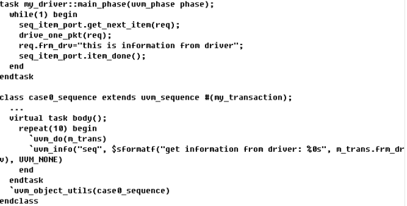 (2) 但是,seq内的uvm_do语句执行完毕后,其第一个参数并不是一个空指针,而是指向刚被送给driver的transaction(drviver中向req中的成员变量赋值,而sequence则检测这个值).