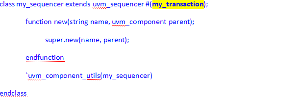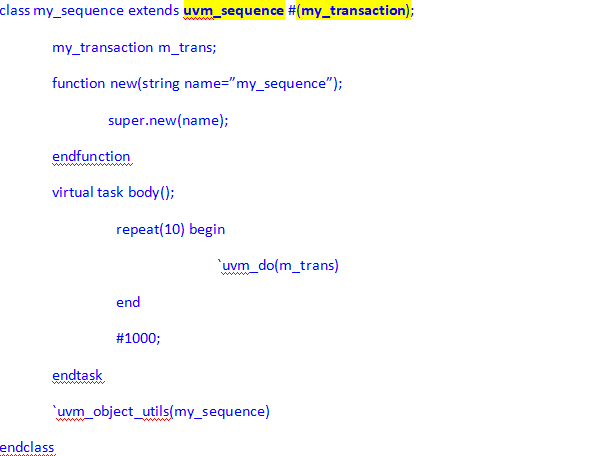 (1) 每一个sequence都应该派生自uvm_sequence,并且在定义时指定要产生的transaction类型,此处为my_transaction(不一定非要指定transaction,但如果不指定在定义body task或drive时,需要做额外的cast操作,详见seq构建部分-seq构建之类的派生).