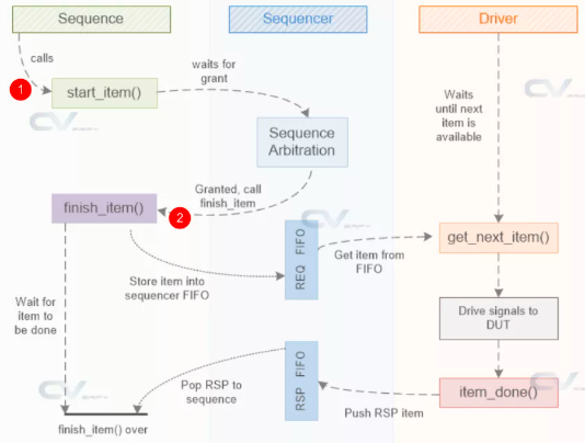 (1) 一个sequence在向sequencer发送transaction前,会先向sequencer发送一个请求, sequencer把这个请求放在一个仲裁队列中. sequencer主要做两件事情: 检测仲裁队列里是否有某个sequence发送transaction的请求; 检测driver是否申请transaction.