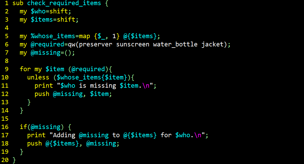 2.下图展示的子程序中,将扫描过程中找到的任何丢失的项放入到@missing数组中,然后对$items数组引用进行解引用操作,访问初始化数组,添加来自于@missing数组的元素. 如果没有按引用传递,就需要修改数据的本地副本,而这将对于初始数组没有任何影响.