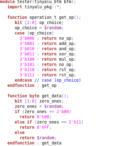 (2) tinyalu_bfm提供了一个reset_alu() task,还有一个向DUT发送指令的send_op() task;