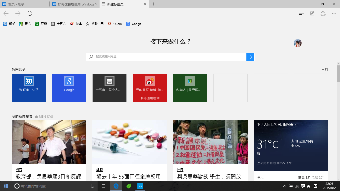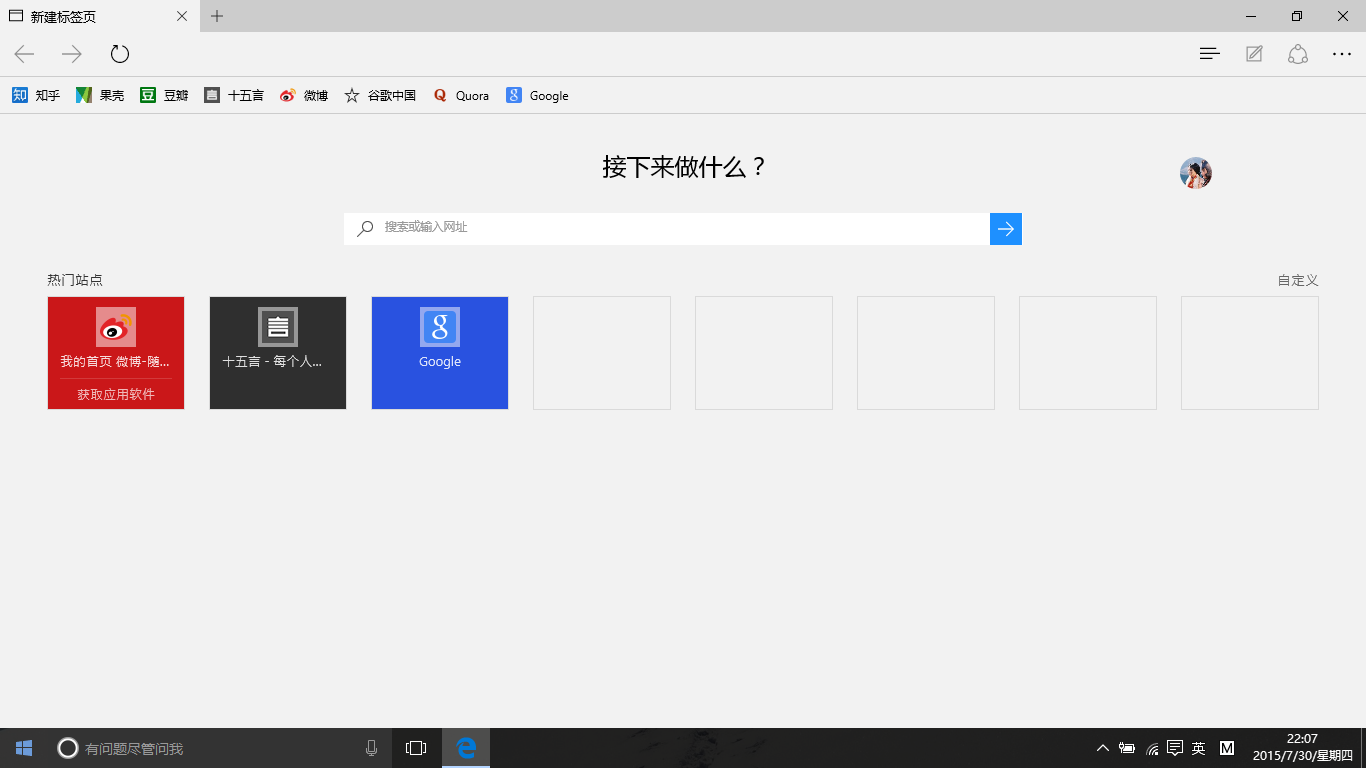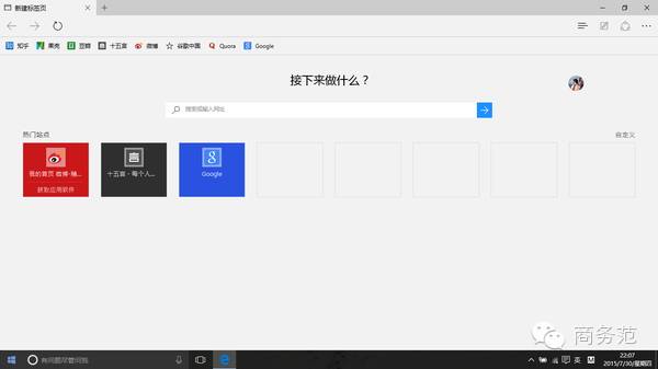 还有Microsoft Edge,我保证,这一定是下一代最最流行的浏览器,整款浏览器给人的感觉就是舒适,流畅。如此优雅的浏览器就一定不要再用那些诸如haoX23之类的作为首页了,让人一看就大小便失禁,优雅的使用方式是这样的
