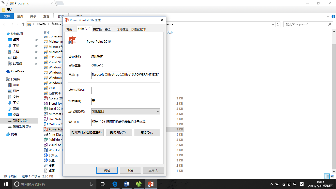 右键打开你常用软件设置快捷键,比如PPT就可以设置为Ctrl+Alt+P,方便又优雅。如果是寻找文件的话,可以直接Windows+Q调出搜索,同样十分迅速。