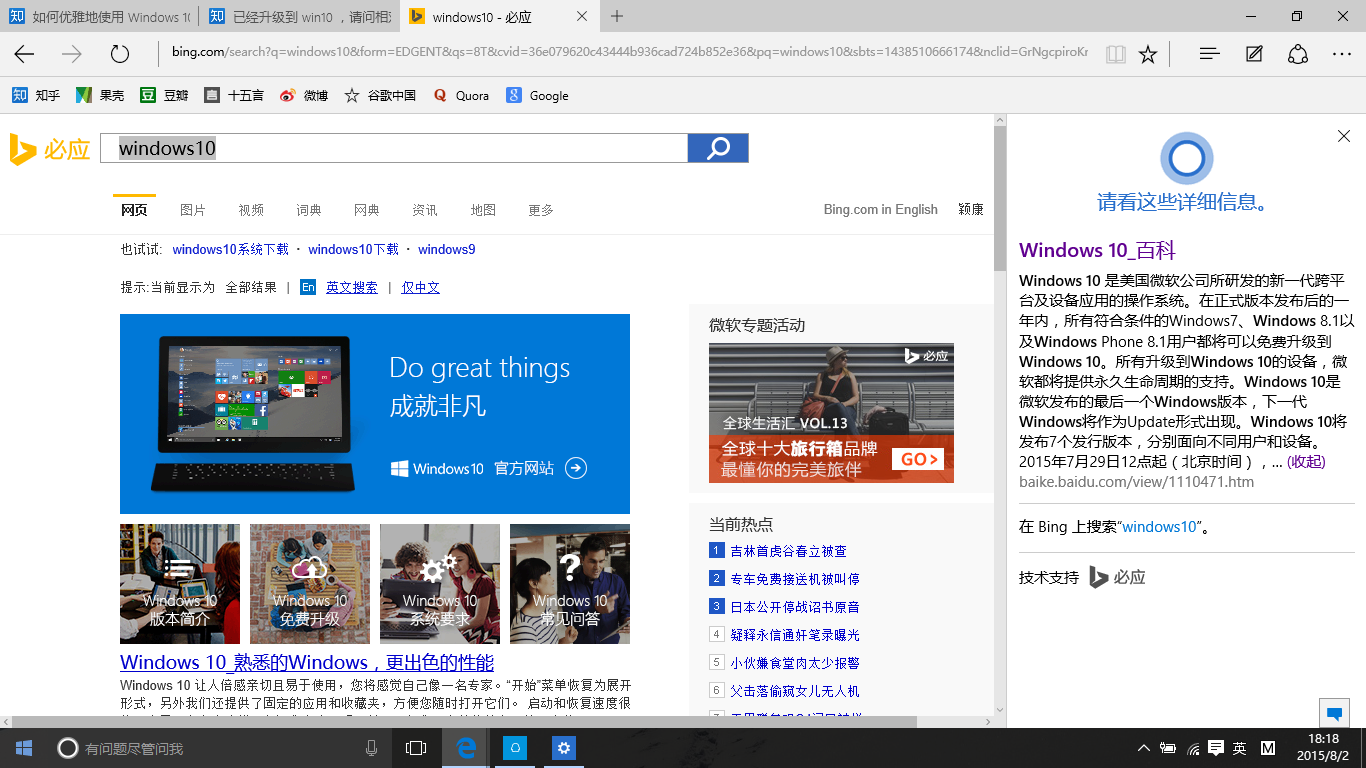 还有,Edge浏览器也自动整合了小娜,可以在不跳转页面情况下对要搜索的词条进行有效的了解,效率也很高。