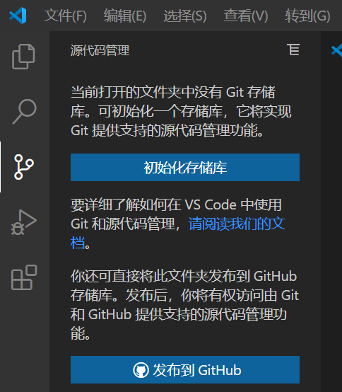 打开一个文件夹,文件夹里没有Git存储库,这时打开源代码管理(Ctrl+Shift+G)大致如下图,可以直接点击【初始化存储库】按钮,初始化一个Git本地版本库。