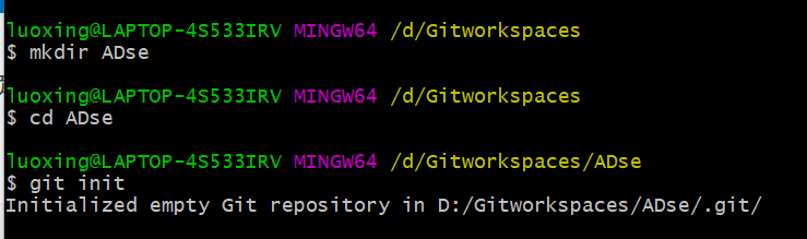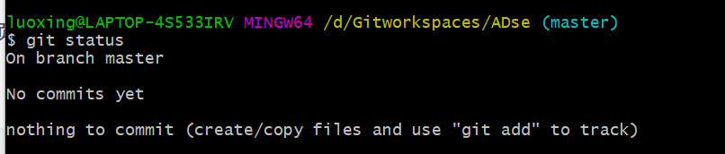 创建目录并且初始化本地版本库。通过 git status命令查看当前Git本地版本库 workspace 的状态: