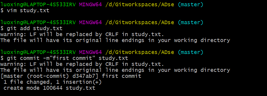 将文件study.txt提交到暂存区,然后再提交到本地版本库: