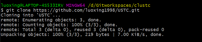 使用clone命令将刚刚push到远程库的文件克隆下来: