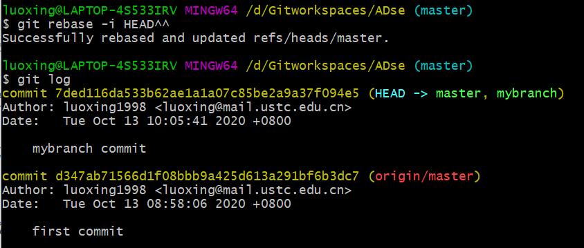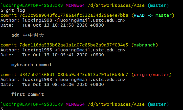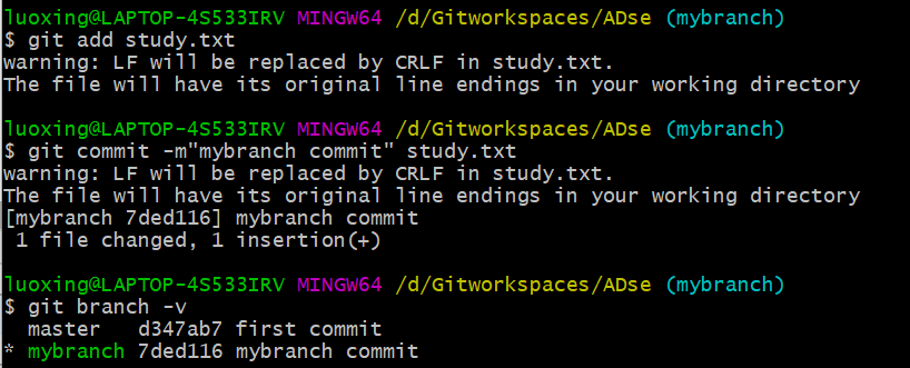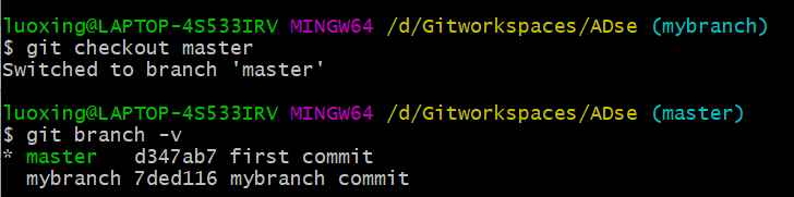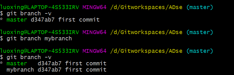 可以看到原本只有一个分支master,后创建了一个mybranch分支。