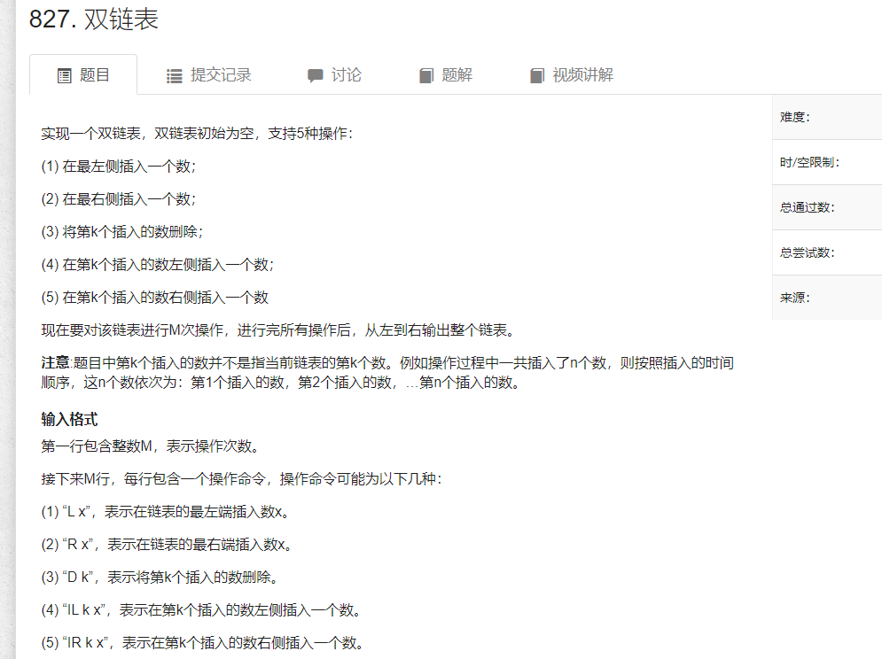 1 #include <iostream> 2 3 using namespace std; 4 const int N=100010; 5 int m ; 6 7 int e[N],l[N],r[N],idx; 8 9 //初始化 10 void init() 11 { 12 r[0]=1; 13 l[1]=0; 14 idx =2; 15 16 } 17 //插入:右边 18 19 void insert(int k,int x) 20 { 21 e[idx]=x; 22 23 //改变四条边 24 r[idx]=r[k]; 25 l[idx]=k; 26 l[r[k]]=idx; 27 r[k]=idx; 28 29 idx++; 30 31 } 32 //插入:左边(k) 33 34 /* 35 其实就是 add(l[k],int x); 36 */ 37 38 //删除 39 void remove(int k) 40 { 41 r[l[k]]=r[k]; 42 l[r[k]]=l[k]; 43 } 44 45 int main() 46 { 47 cin>>m; 48 init(); 49 50 while(m--) 51 { 52 string op; 53 cin>>op; 54 55 int k,x; 56 if(op=="L") 57 { 58 cin>>x; 59 insert(0,x); 60 } 61 else if(op=="R") 62 { 63 cin>>x; 64 insert(l[1],x); 65 } 66 else if(op=="D"){ 67 cin>>k; 68 remove(k+1); 69 } 70 else if(op=="IL") 71 { 72 cin>>k>>x; 73 insert(l[k+1],x); 74 } 75 else{ 76 cin>>k>>x; 77 insert(k+1,x); 78 } 79 80 81 } 82 //从左到右遍历双链表 83 for(int i=r[0];i!=1;i=r[i]) cout<<e[i]<<' '; 84 cout<<endl; 85 86 return 0; 87 }