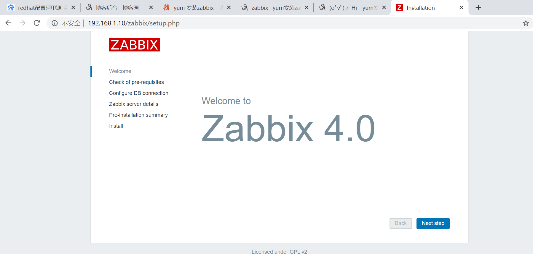 8、启动之后在浏览器上输入http://192.168.1.10/zabbix,进入web界面,Admin/zabbix