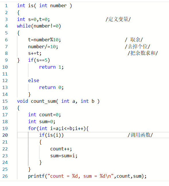 函数count_sum利用函数is统计给定区间[a, b]内有多少个满足上述要求(即令is返回1)的整数,并计算这些整数的和。最后按照格式