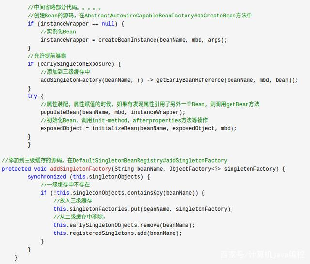 1、A依次执行doGetBean、查询缓存、createBean创建实例,实例化完成放入三级缓存singletonFactories中,接着执行populateBean方法装配属性,但是发现有一个属性是B的对象。