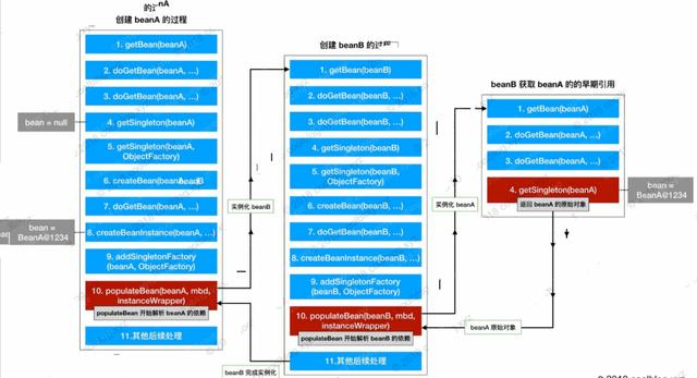 根据以上的分析,大概清楚了Spring是如何解决循环依赖的。假设A依赖B,B依赖A(注意:这里是set属性依赖)分以下步骤执行: