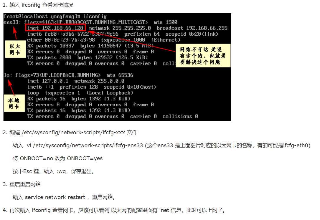查阅网络后,通过编辑/etc/sysconfig/network-scripts/ifcfg-xxx(这个xxx取决于你的以太网卡)解决,我安装之后/etc/sysconfig/network-scripts这个文件夹是存在的,但是ifcfg-xxx不存在,我自己创建并且编辑,具体步骤在下图: