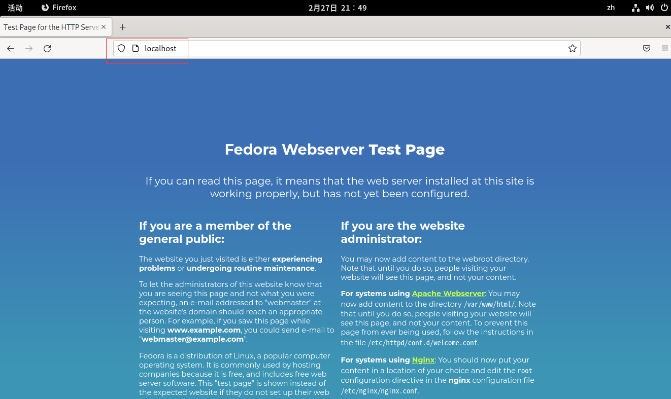 之后在fedora自带的火狐浏览器里输入http://localhost/来测试是否开启。如果出现如下图所示,则证明开启成功。如果80端口被占用(比如nginx),则有可能开启不成功。