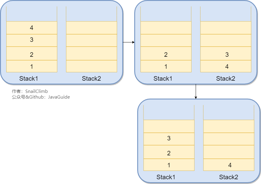 我们只需要使用两个栈(Stack1 和 Stack2)和就能实现这个功能。比如你按顺序查看了 1,2,3,4 这四个页面,我们依次把 1,2,3,4 这四个页面压入 Stack1 中。当你想回头看 2 这个页面的时候,你点击回退按钮,我们依次把 4,3 这两个页面从 Stack1 弹出,然后压入 Stack2 中。假如你又想回到页面 3,你点击前进按钮,我们将 3 页面从 Stack2 弹出,然后压入到 Stack1 中。示例图如下: