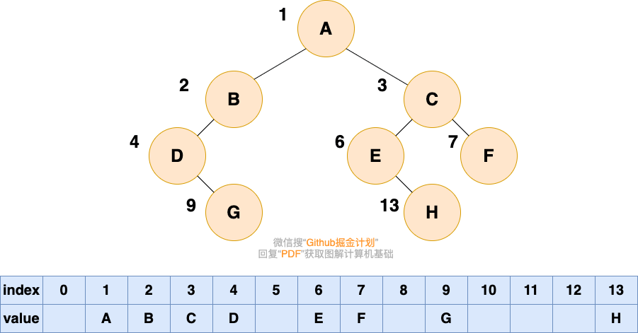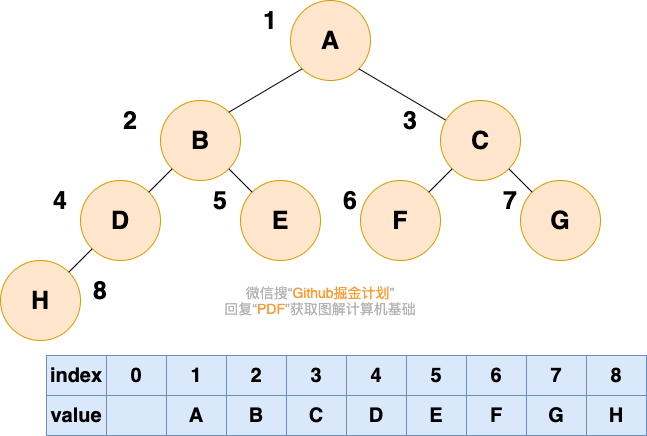 顺序存储就是利用数组进行存储,数组中的每一个位置仅存储节点的 data,不存储左右子节点的指针,子节点的索引通过数组下标完成。根结点的序号为 1,对于每个节点 Node,假设它存储在数组中下标为 i 的位置,那么它的左子节点就存储在 2i 的位置,它的右子节点存储在下标为 2i+1 的位置。