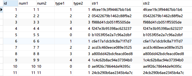 先来看这组 SQL,一共四条,我们的测试数据表num1是int类型,num2是varchar类型,但是存储的数据都是跟主键id一样的顺序数字,两个字段都建立有索引。