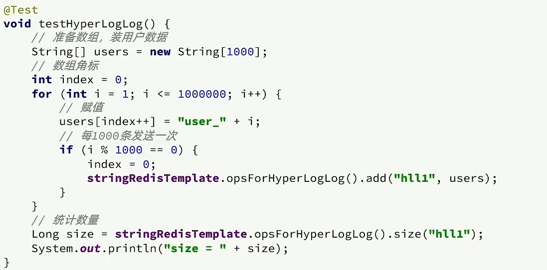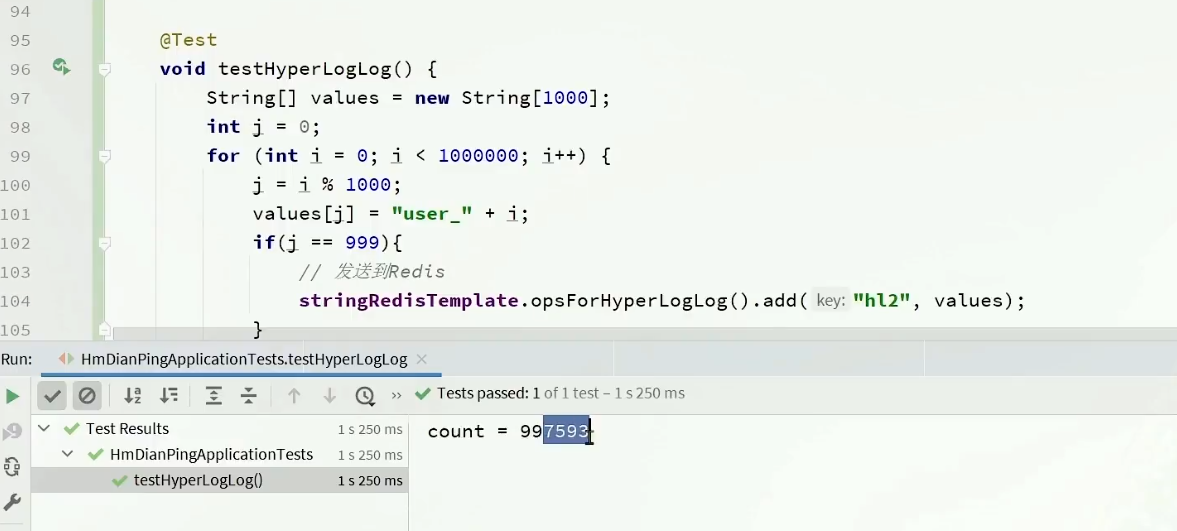 测试思路:我们直接利用单元测试,向HyperLogLog中添加100万条数据,看看内存占用和统计效果如何