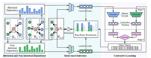 CENET模型架构如上图所示,左侧部分从历史和非历史依赖中学习实体的分布。右侧说明了历史对比学习的两个阶段,旨在识别高度相关的实体,输出是布尔掩码向量。中间部分是基于掩码的推理过程,它结合了从两种依赖和掩码向量中学习到的分布来生成最终结果。