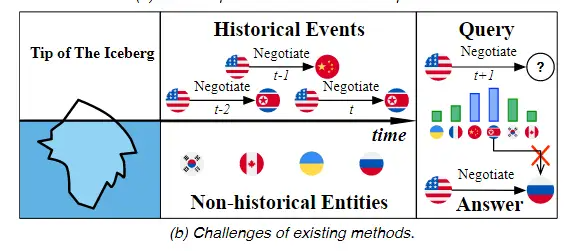 存在的问题:然而,许多重复和周期性的事件只与历史实体相关联。此外,对于新事件,现有模型可能会忽略那些历史交互较少的实体,并预测出与其他事件频繁交互的错误实体。