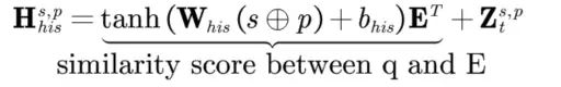 数学公式: \({\mathbf{H}_{nhis}^{s,p}=\tanh \left( \mathbf{W}_{nhis}\left( s\oplus p \right) +b_{nhis} \right) \mathbf{E}^T-\mathbf{Z}_{t}^{s,p}}\)