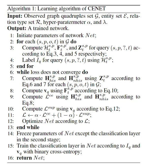 其中oi表示给定查询q的基础真值对象实体。数学公式: \({\mathcal{L}^{ce}}\)的目的是通过比较数学公式: \({\mathbf{H}_{his}^{s,p}}\)和数学公式: \({\mathbf{H}_{nhis}^{s,p}}\)中的每个标量值来区分基础真值。在推理过程中,CENET将上述两个潜在上下文向量的softmax结果组合为所有对象实体的预测概率数学公式: \({\mathbf{P}_{t}^{s,p}}\):