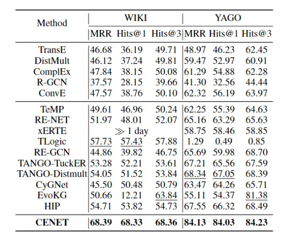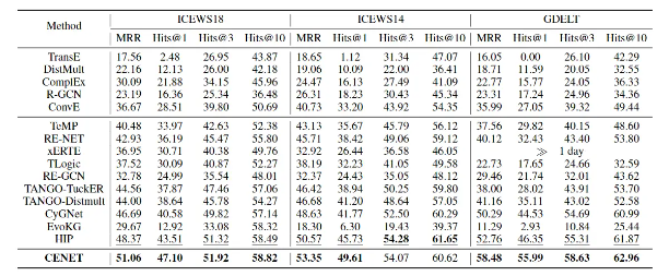 3.我们对五个公共基准图进行了实验。结果表明,CENET 在事件预测任务中优于最先进的 TKG 模型