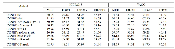 CENET-his只考虑历史依赖关系,而CENET-nhis保留非历史依赖关系。两者都采用了对比学习法。CENET-his的性能优于CENET-nhis,因为大多数事件都可以追溯到它们的历史事件,特别是在基于事件的TKGs中。不过,对于CENET-nhis来说,它在一定程度上也有助于事件预测。因此,有必要同时考虑这两种依赖关系。我们删除了sup,只保留Lce作为CENET-Lce的变体。在ICEWS18的情况下,Lce能够获得接近提议的CENET的高结果,而YAGO的结果下降了约7%。这些结果验证了第一阶段在历史对比学习中的积极作用。CENET-w/o-stage-2是另一个变体,它在不训练二元分类器的情况下最小化Lce和Lsup,这自然会放弃基于掩码的推理。这些变化导致ICEWS18和YAGO的Hits@1分别下降1.7%和3.8%。去除历史对比学习的CENET-w/o-CL比上述两种变体的性能差。这些结果证明了我们提出的历史对比学习的意义。至于面具策略。掩码向量是CENET-random-mask中随机生成的布尔向量。cenet -硬掩码和cenet -软掩码是我们提出的两种处理掩码矢量的方法。我们使用测试集中的ground truth生成一个由CENET- gt -mask表示的掩码向量来探索CENET的上界。我们可以看到,未经训练的随机生成掩模向量的模型对预测是适得其反的。