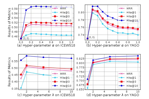 超参数α旨在平衡Lce和lsup的贡献。在ICEWS18上,α有临界,而在YAGO中,α在比较小的地方比较好,所以最后α设置为0.2;我们可以看到λ的值越高,YAGO上的结果越好,而ICEWS18上的结果越差。因此,λ设为2。