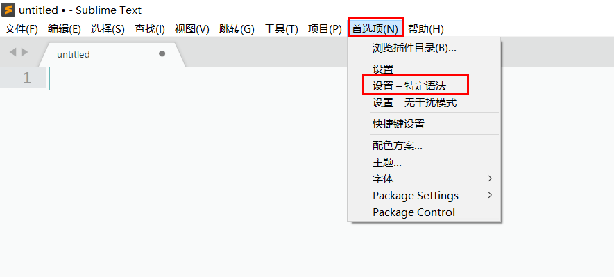 - 打开Sublime,在最上方菜单栏点击Preferences(中文“首选项”),然后点击(中文“设置-特定语法”)
