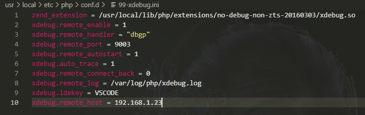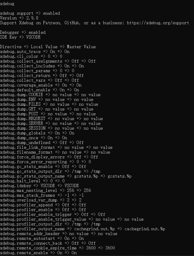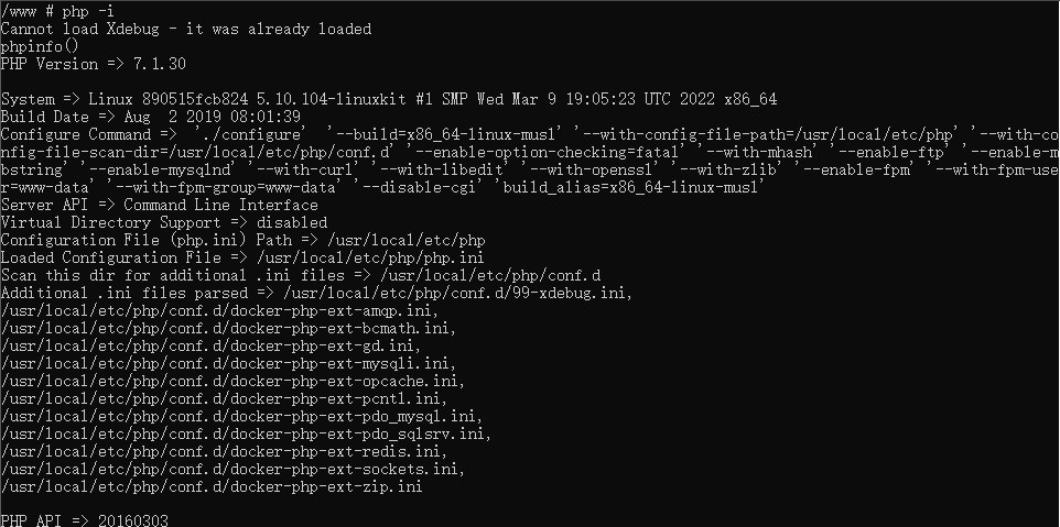 以上配置完成后,到php容器中phpinfo查看xdebug是否安装成功:php -i命令查看: