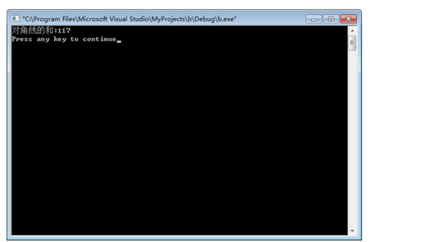 #include <stdio.h> main() { int m[5][5]={{1,2,3,4,5},{6,7,8,9,10},{11,12,13,14,15},{16,17,18,19,20},{21,22,23,24,25}}; int i,j,sum=0; for ( i=0;i<5;i++ ) { for ( j=0;j<5;j++ ) { if ( i==j||i+j==4 ) { sum+=m[i][j]; } } } printf ( "对角线的和:%d\n",sum ); }