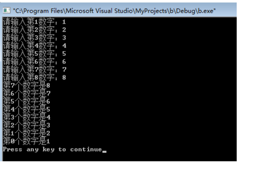 #include <stdio.h> main() { int a[8],i,j; for( i=0;i<8;i++ ) { printf( "请输入第 %d数字",i+1 ); scanf( "%d",&a[i] ); } for( j=7;j>=0;j-- ) { printf( "第%d个数字是 %d\n",j,a[j] ); } }