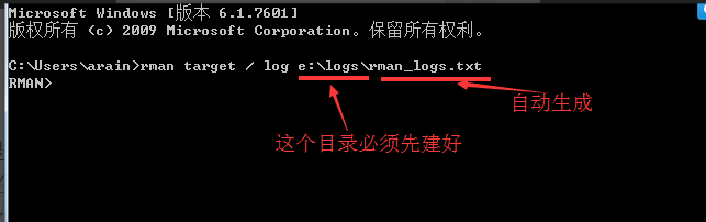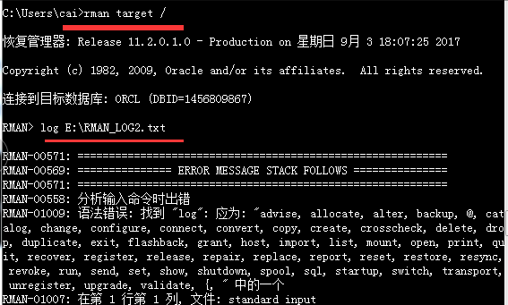 切勿将命令分开执行,将报错如下,目前猜想应该是window生成rman的日志文件,rman工具本身不具备生成目录的能力。