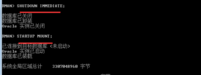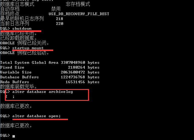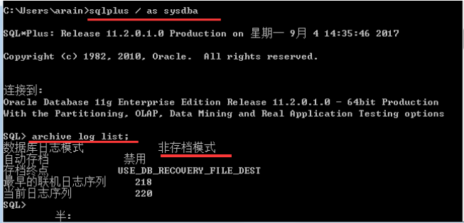 步骤二、如步骤一中,查得数据库处于“非存档模式”,现在就需要将数据库转为存档模式。命令如下: