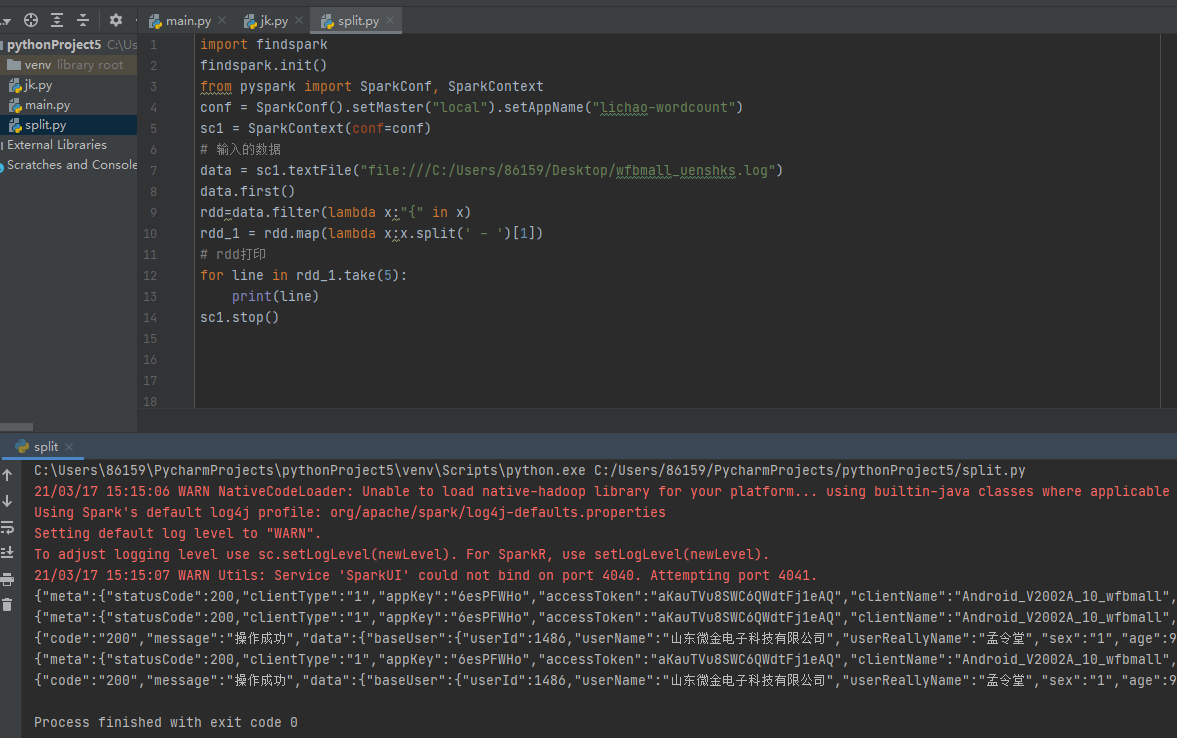 data = sc1.textFile("file:///C:/Users/86159/Desktop/wfbmall_uenshks.log") #读取本地文件