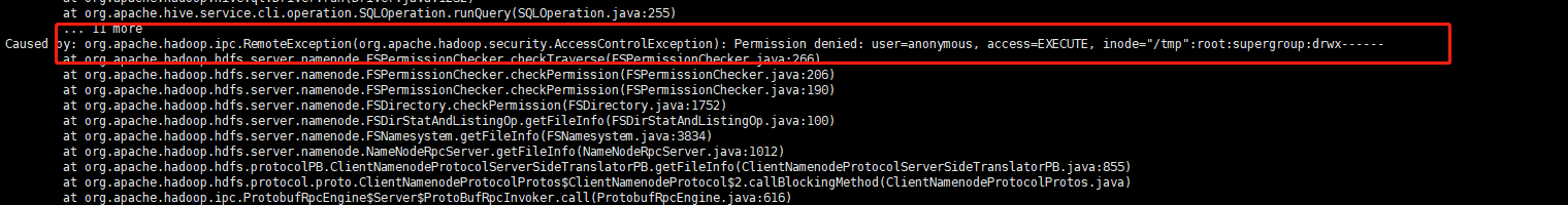 Caused by: org.apache.hadoop.ipc.RemoteException(org.apache.hadoop.security.AccessControlException): Permission denied: user=anonymous, access=EXECUTE, inode="/tmp":root:supergroup:drwx------